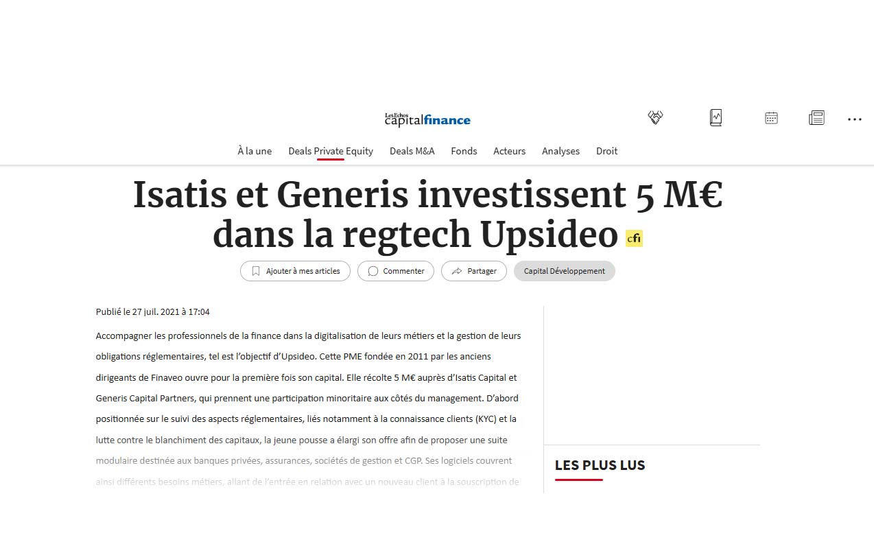 Spécialisée dans la digitalisation et la gestion des obligations réglementaires, ÜPSIDEO accompagne les acteurs financiers en automatisant l’ entrée en relation , le KYC et la LCBFT . Initialement axée sur la conformité, elle propose désormais une suite modulaire comprenant la souscription numérique , le suivi des allocations d’actifs et la gestion des contrats.